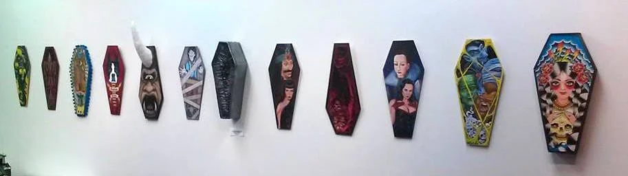Our annual group show of coffin shaped artworks will run from October 2 through 31. Join us for the opening reception on Friday, October 2 from 6 to 9:30 PM for refreshments, music, and to meet the artists.
